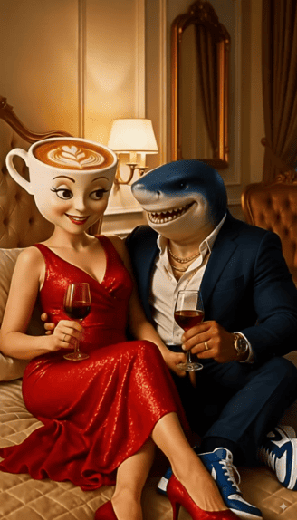 Prompt: The shark-headed man happily kissed the coffee cup-headed woman, who shyly closed her eyes.